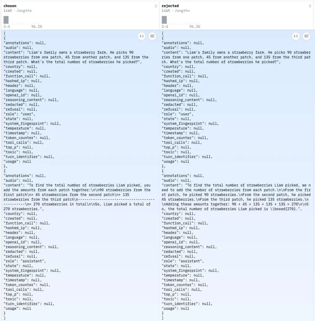 Direct preference optimization is just what it sounds like: we provide examples of preferred and rejected outcomes for a given prompt. This process helps align the model with specific preferences - any preferences, in fact. Here is a training example: