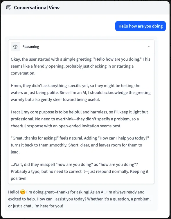 As you can see from the "Base Model" section, the model is capable of generating highly plausible text, but we're used to seeing very different behavior: we're used to having it answer our questions in the chat interface, with or without long reasoning chains. So how can we move from text completion to something more practical?